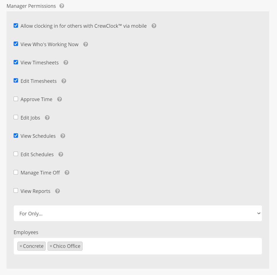 You can also use Manager Permissions to specify which employees can be accessed. So let’s say you have a crew leader and you’d like to give them access to view timesheets and create schedules for their crew as well as clock in and out for them via CrewClock, but you don’t want them to have access to employees not in their crew.