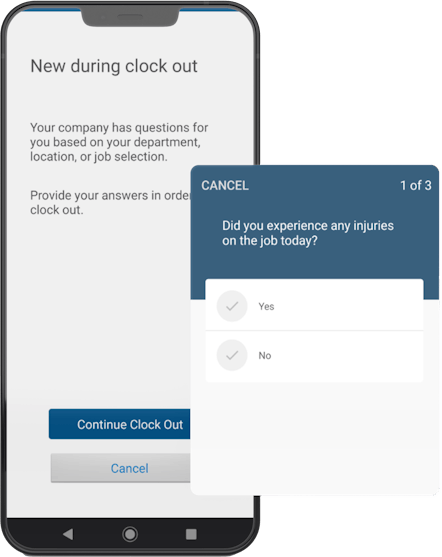 Quickly customize a short questionnaire for the information or attestation you need to collect. Assign it to a job, department, or office location to start collecting answers from people when they clock out for the day or when they finish work on a specific job.