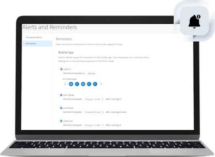 Set clock in and out reminders for specific times and days of the week. It's perfect if employees arrive and leave at the same time each day. You can send the reminder via email, mobile push notification, or both. Employees get a helpful reminder to clock in or out at the times you choose.